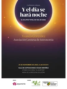 Conferencia-coloquio Y el día se hará noche EL ECLIPSE TOTAL DE SOL DE 2026. Xuaxús González. Asociación leonesa de Astronomía.El Albéitar