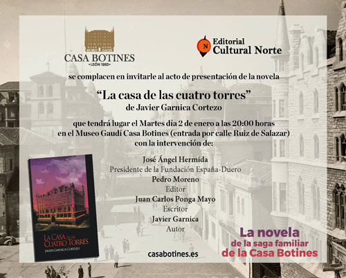 Día 2 de enero a las 20:00 horas, el Museo Gaudí Casa Botines acogerá la presentación de «La casa de las cuatro torres», novela de Javier Garnica Cortezo que cuenta la historia de las familias que formaron parte del proceso de creación de la Casa Botines y las relaciones personales y de intereses que giraron alrededor de ella, introduciendo al lector en la atmósfera de un León que ya no existe, pero del que todavía quedan muchos vestigios.
