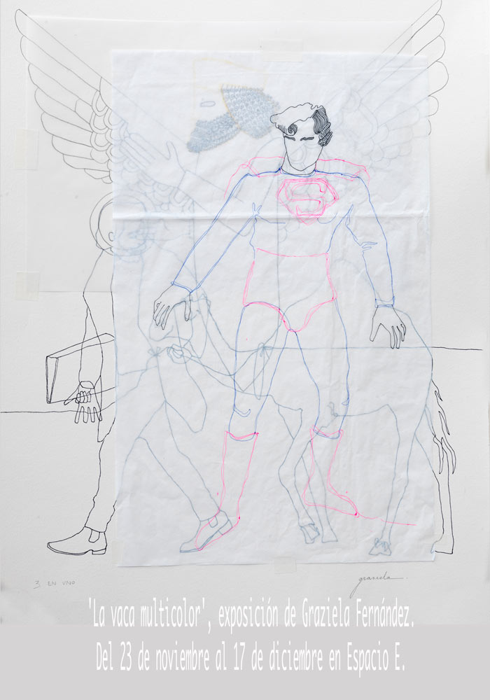 Del 23 de noviembre al 17 de diciembre en Espacio E, mostramos una pequeña parte de esta historia con el secuestro de 12 ilustraciones y 4 estómagos de entre las 30 imágenes que la componen. Os dejo también un taburete y una máscara por si alguien siente la necesidad de exponerse ante “La vaca multicolor”.