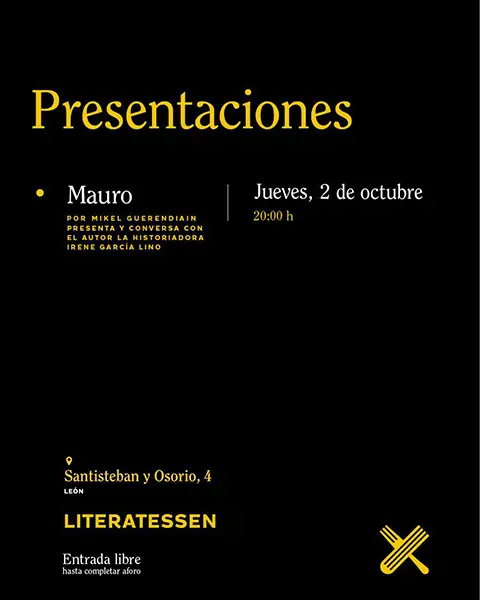 El jueves 2 de octubre a las 20 horas Mikel Guerendiain presentará en la librería Literatessen de León su primera novela. Se titula «Mauro» y está editada por la editorial Pepitas de Calabaza (https://www.pepitas.net/ libro/mauro)
