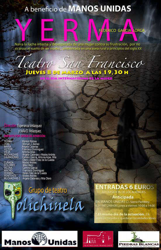 Manos Unidas León organiza en el Teatro San Francisco «Yerma» un montaje teatral de la compañía Polichinela, día 8 de Marzo, celebramos el Día de la Mujer.